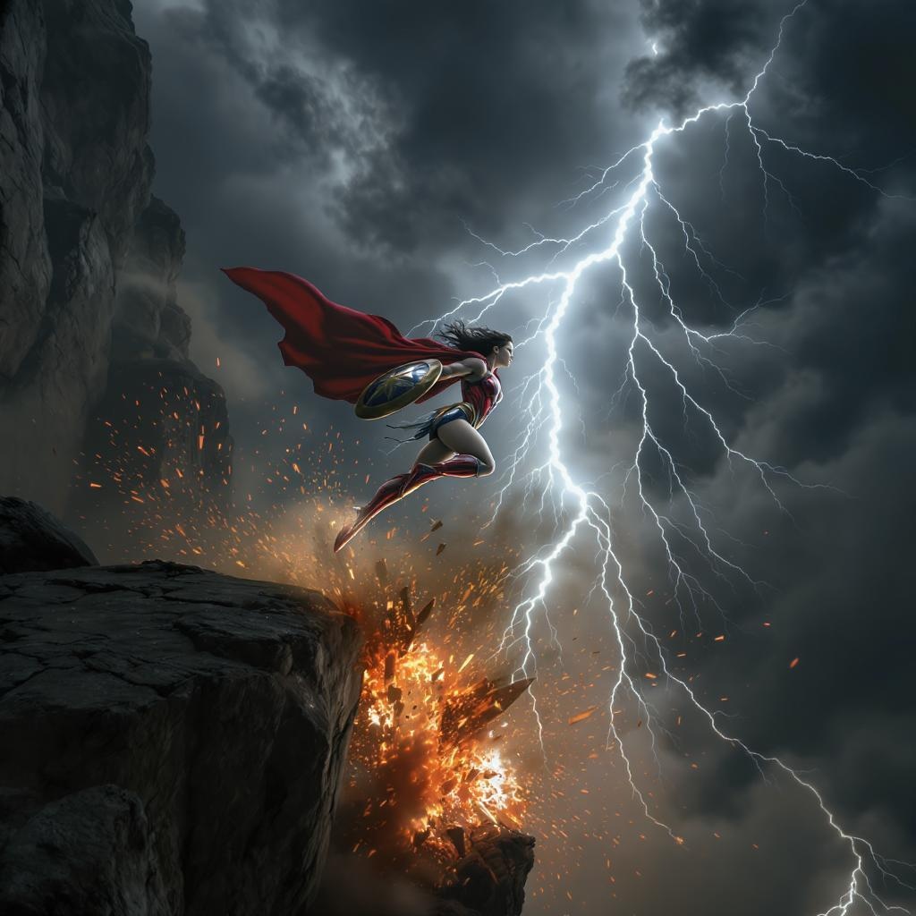 In an epic slow-motion sequence, a young female superhero, inspired by Wonder Woman, leaps from a towering cliff into a tumultuous battlefield below. The dense, swirling storm clouds above are illuminated by the chaotic dance of lightning, casting an electrifying glow over the scene. The camera captures her ascent from below, showcasing every graceful movement as she soars through the air, her flowing cape trailing behind like a banner of hope. Her armor shimmers with every flash of light, and her shield is firmly secured to her arm, a symbol of unyielding strength. Her eyes burn with a fierce determination that radiates power. As she touches down onto the battlefield, the impact is cataclysmic; the ground shatters beneath her, creating a massive shockwave that sends dust and kinetic energy rippling outward. The opposing forces stagger back, paralyzed by the display of her might. The atmosphere is profoundly cinematic, enriched by a stormy backdrop and dramatic lighting, all brought to life through ultra-realistic visuals and high-quality animation.