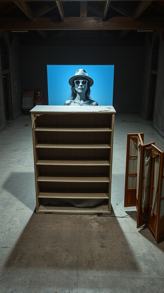 In an expansive, dimly lit, and abandoned space seen from above, three distinct sculptures are carefully arranged. At the center stands "Sculpture one," a plaster rendering of a classic wooden living room bookcase. Its slightly damaged surface exposes parts of its metallic structure, with the detailed textures of plaster and metal clearly visible. Empty shelves await the glow of a 16mm film projector, casting a black and white video of a half-naked Portuguese girl donning an urban hat onto the sculpture's form. To the right, "Sculpture two" features a folding screen crafted from paper with a wooden frame, reminiscent of a Japanese Nanban screen. The semi-open screen remains devoid of relief or adornment, instead hosting a video projection in vibrant color. This displays a biblical character in red attire wearing sunglasses against a serene blue sky, focusing solely on the face. To the left, "Sculpture three" is a wooden puppet theater accented with Alentejo textiles. Slumbering within are the "Bonecos de Santo Aleixo," delicately scaled to the hand, with the theater itself smaller in comparison to the other two sculptures. These three creations are dwarfed by the vast setting, where only faint natural light trickles through small ceiling windows, punctuated by the gentle glow of the sculptures’ projectors.