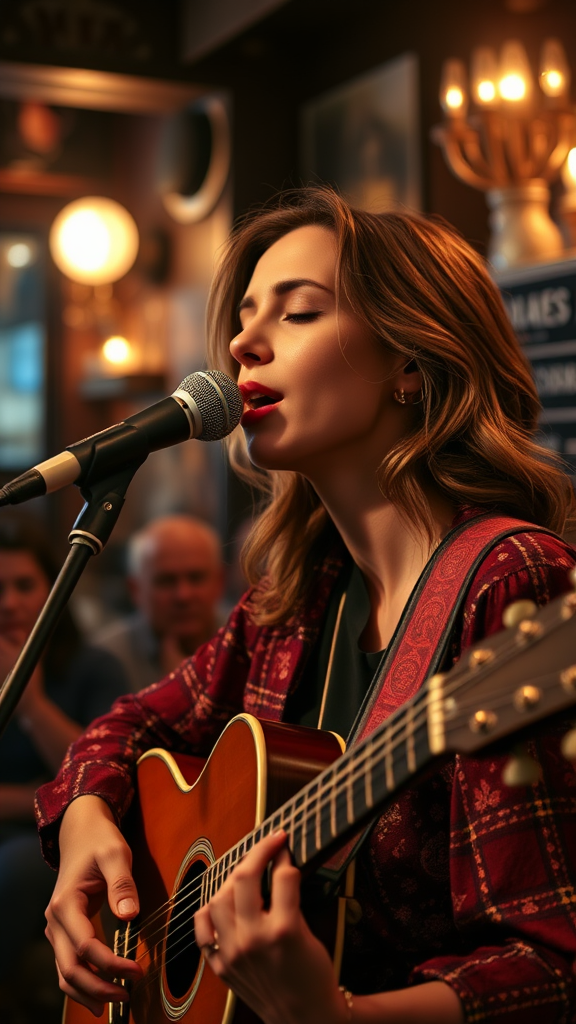 In an intimate pub setting, a gifted female singer-songwriter graces the stage, her soul-stirring ballads resonating with the audience, her voice rich and captivating. Captured in 8K with a Canon EOS 5D Mark IV, this high-resolution image is a masterpiece of fine art photography. The scene features exquisite cinematic lighting and hyper-detailed, maximalist elements, with every facet - from the singer's expressive face to the intricate textile textures of her attire - rendered in crystal-clear focus. The photograph embodies award-winning quality, with impeccable shading and a pristine, clean finish, perfect for magazine or advertising use.