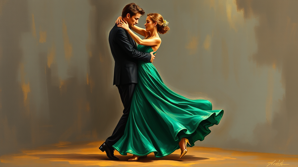 In an oil painting, a man and woman are passionately dancing the tango, both adorned in exquisite formal attire. The woman dazzles in an emerald green dress that contrasts beautifully with the deep gray background, which adds an air of mystery and sophistication. The man, in a classic black tuxedo, complements her elegance. Warm golden light subtly illuminates their flowing movements, evoking a sense of romance and drama.