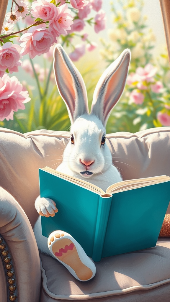 In an oil painting infused with pastel hues, a white rabbit with exceptionally long ears lounges on a cozy sofa, engrossed in a vivid turquoise children's picture book. The painting radiates a sense of warmth and charm through its delicate and detailed brushstrokes. The rabbit's face is the heart of the scene, framed by a blooming garden backdrop bathed in the gentle glow of spring sunshine. The play of natural light adds a vibrant and dynamic essence, with tiny, thoughtful strokes of oil paint breathing life into the idyllic day.