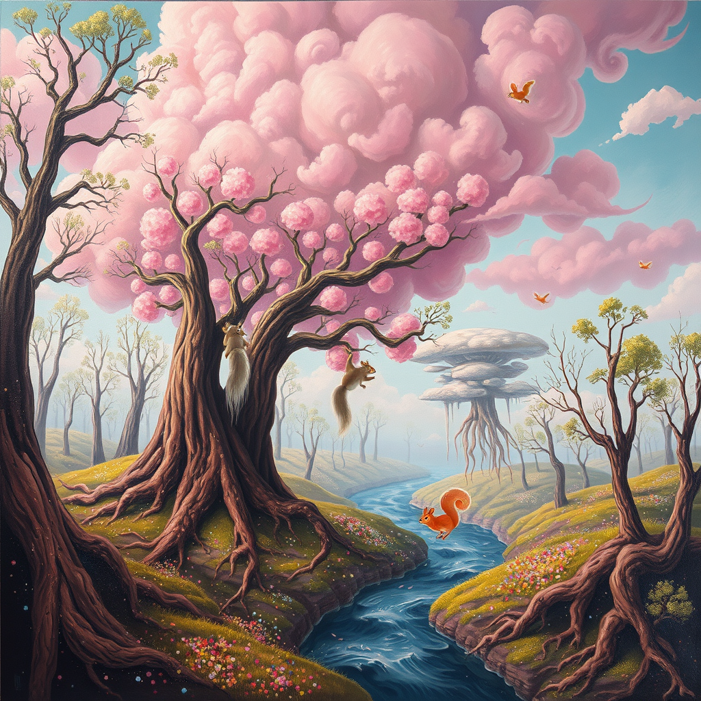 In an oil painting of a whimsical forest, bubblegum clouds drift lazily overhead, casting a rosy hue over a magical woodland where confetti-filled rivers wind through the trees. The setting is an otherworldly realm with trees that hover mysteriously, their roots dangling like a spectacle in the sky. The mood is humorously enchanting, with polka-dotted squirrels darting playfully among the branches. This landscape uses a color-changing paint palette reminiscent of three chromatic hues, intertwined with the sacred geometry of three flowers of life, captured through the perspective of an ultra wide angle lens.