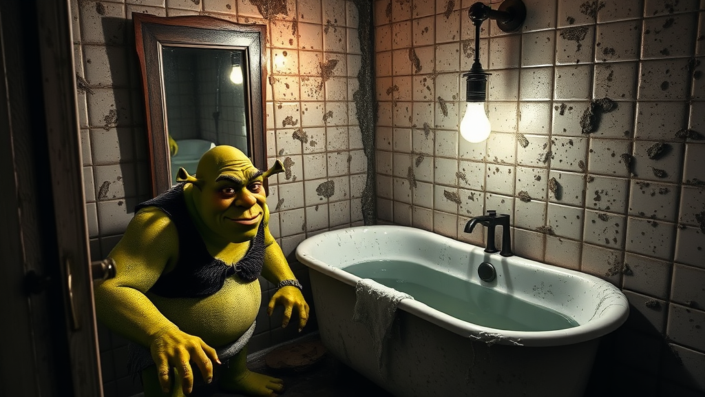 In an old, grimy bathroom of an abandoned house, Shrek, his skin slick with slime and eyes crimson with intensity, crouches beside a crumbling bathtub filled with stagnant water. The tiles are shattered and the mirror is foggy, speckled with mold creeping across every surface. The scene is dimly lit by a flickering light bulb, casting erratic shadows that twist the reflections of both characters in the mirror, creating an eerie and unsettling atmosphere.