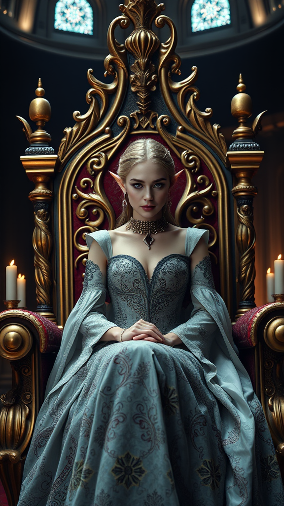 In an opulent fantasy castle hall, a captivating royal elf woman with an enchanting face sits poised on a magnificent throne-like chair. Her ethereal beauty is enhanced by a luxurious, intricately designed dress that exudes regality. The scene is captured with cinematic lighting using a Nikon D850, presenting an ultra-detailed upper body portrait with a shallow depth of field. The atmosphere is reminiscent of a film still, enhanced by HDR in 8k resolution, embodying a CyberRealistic aesthetic subtly touched by the mystical undertones of a waking dream.