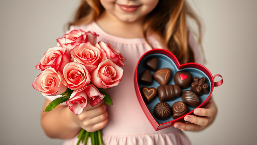 In her right hand, the young girl clutches a bouquet of fragrant roses, their petals soft to the touch and showcasing hues from delicate blush to rich crimson. In her left hand, she balances a heart-shaped box filled with chocolates, each piece adorned with a unique design and offering indulgent flavors that dissolve sumptuously on the tongue.