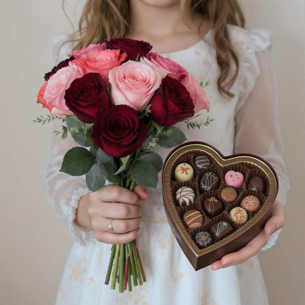 In one hand, the girl carries a bouquet of enchanting roses, their petals incredibly soft to the touch and displaying hues from soft pink to rich burgundy. In the other hand, she holds a heart-shaped box of gourmet chocolates, each piece artfully crafted with distinctive designs and filled with luxurious flavors that melt on the tongue. The scene radiates elegance and indulgence.