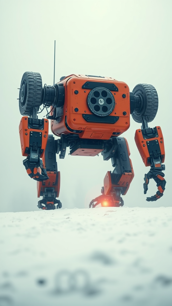 In the aftermath of a cataclysmic event, a vibrant orange robot navigates the desolate landscape, its metallic frame contrasting starkly against the endless expanse of snow and fog. The camera captures its journey through a series of dynamic close-up shots, highlighting the intricate gears and mechanisms that whir with life amidst the stillness. Low angles emphasize the robot's resilience and determination as it trudges through the whiteness, its footsteps leaving a trail in the softly falling snow, casting a faint glow in the pervasive mist that swirls around it. The atmosphere is hauntingly serene, a world frozen in time, where the only sound is the gentle crunch of snow underfoot and the soft hum of the robot's inner workings.