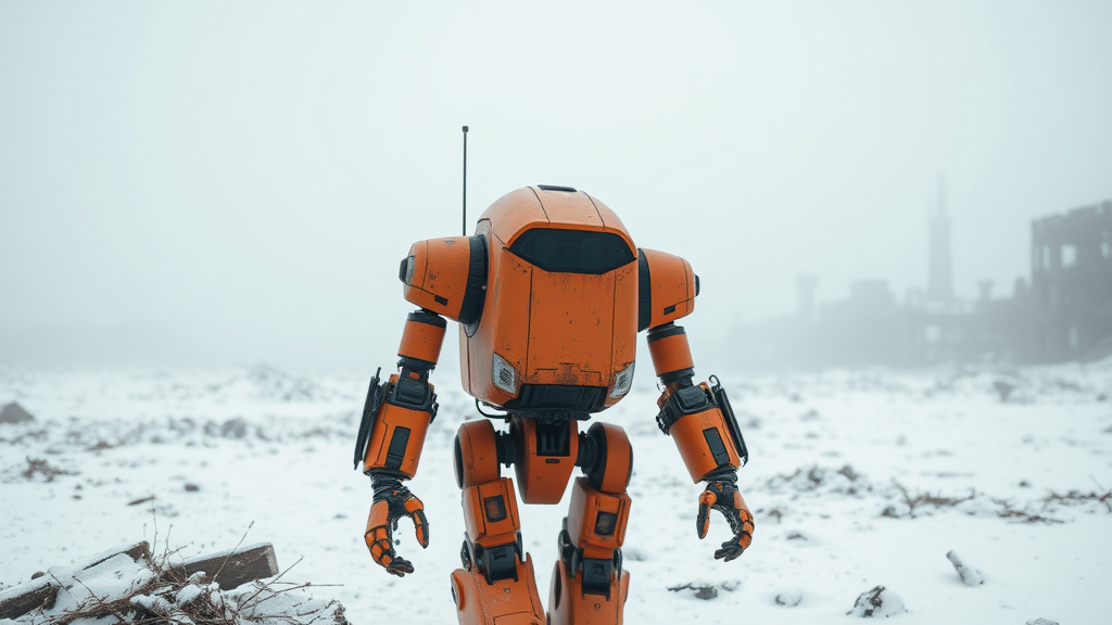 In the aftermath of a world transformed, amidst the desolate beauty of a post-apocalyptic landscape, a lone orange robot navigates the snowy wasteland. The air is thick with fog, shrouding the ruins in an eerie silence, while close-up shots capture the intricate details of the robot's weathered exterior. Each low-angle view emphasizes its resilience against the stark white backdrop, as it moves through the ghostly remnants of civilization, a vivid splash of color and life in a world that has all but forgotten its past.