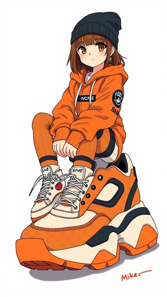 In the artwork, a girl is depicted sitting atop an oversized pair of sneakers, rendered in an anime drawing style with a nod to ukiyo-e art. The illustration is shared on Tumblr, capturing a unique blend of traditional and modern aesthetics. She wears a beanie and a hoodie paired with work clothes that boast a techwear flair, reminiscent of Tsutomu Nihei's style. Her face is adorably anime-like, yet her outfit exudes a professional sports vibe, enhanced by the sleek design of her shoes. The color scheme of the piece is dominated by vibrant orange and deep black tones, and it is signed by the artist, Mike.