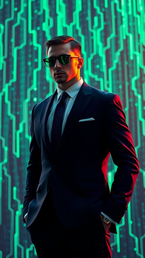 In the backdrop, a captivating matrix of glowing lines in a vivid emerald shade weaves an intricate pattern, with streams of digital data cascading in every direction, creating a dynamic cyberpunk ambiance. At the image's heart stands a poised man clad in a meticulously tailored midnight-blue suit paired with a pristine white shirt and a slender navy tie. His enigmatic expression is partially hidden by chic, reflective black sunglasses, capturing hints of the green digital cascade, enhancing his aura of mystery. Dramatic lighting casts soft, neon green highlights along his silhouette, creating delicate contrasts against the vibrant matrix backdrop. The scene exudes a blend of sleekness, technological allure, and an air of enigmatic authority.