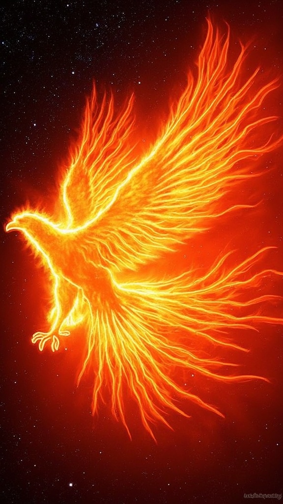 In the beginning, there was only The Creator, and only him/her. The creator caused an explosion, the Big Bang, the beginning of EVERYTHING. The very first created being to emerge from this explosion was The Phoenix, in all of its blinding fiery brilliance and glory. A raptor/falconesque creature of light and flames. It helped to fan the flames of creation as stars and galaxies swirled past its flaming wings. It is a guardian and protector of creation, second only to The Creator. Its flames destroy as well as create, burning away the unnecessary to bring about something new and better. It assists the angels when asked, to fight against evil and the forces of darkness. Should it ever be destroyed, it will re-create itself from nothing, as was given to it by The Creator. The Phoenix lives in the endless universe, it wings spreading across its vastness.