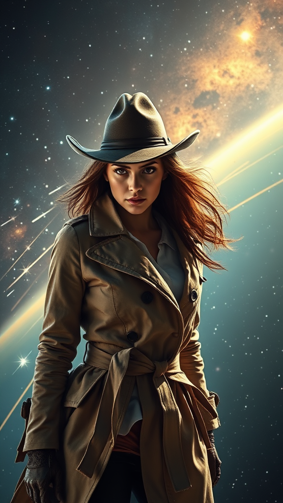 In the boundless expanse of space, a daring and confident figure stands out—a Space Cowgirl, exuding a captivating blend of style and grit. Her weathered trench coat flutters dramatically against the cosmic winds, defying the void of space. Perched atop her head, a timeworn cowboy hat sits at a rakish angle, casting a shadow over her intense, steely eyes. This spellbinding moment captures her exquisite control over both technology and the untamed elements around her. Stars blaze past in brilliant streaks, and far-off galaxies form a stunning celestial canvas, enhancing the mystique of this adventurous traveler. The determined Space Cowgirl weaves an intriguing narrative amid the vastness of the universe, her presence commanding both respect and wonder.