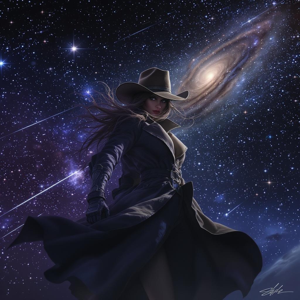 In the boundless expanse of space, a mesmerizing scene unfolds with a daring Space Cowgirl taking center stage. Her presence is a striking blend of rugged charm and futuristic flair, marked by a well-worn trench coat that flutters dramatically even in the vacuum of the cosmos. Anchoring her look, a timeworn cowboy hat is perched at a rakish angle, casting a shadow over her sharp, determined eyes. In this captivating moment, the scene captures her seamless command of both advanced technology and the raw beauty of nature. Stars streak past in a brilliant cascade, while distant galaxies paint a spectacular backdrop. The Space Cowgirl’s unyielding spirit infuses the tableau with an intriguing narrative, adding depth to this cosmic illustration.