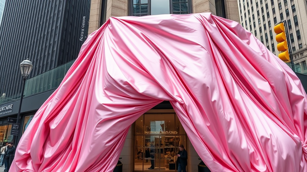 In the bustling heart of New York City, a vibrant street scene showcases a boutique with an extravagant facade draped entirely in a billowing, oversized pink satin fabric. The opulent material cascades dramatically, its excessive volume setting it apart in its grandeur. Every minute detail is captured with astonishing clarity, from the intricate stitching of the silk to the gentle waves created by the wind. This mesmerizing spectacle stands in sharp contrast to the surrounding urban landscape, high-quality, rich in texture, and bursting with surreal grandeur.