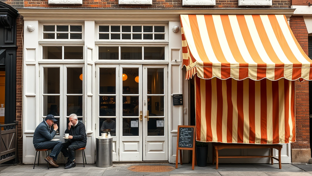 In the bustling heart of New York, there stands a charming ground-level coffee-bakery shop with an inviting ambiance. The building's exterior boasts a quaint charm, featuring white-framed windows that elegantly fold upwards towards the ceiling, welcoming the fresh city air. To the left of the central entrance, a collection of stools and a cozy paso are arranged where patrons leisurely sip steaming coffee, engaged in animated conversation. On the right side, a cheerful striped tent in vertical patterns of muted orange and cream shields the window, adding a whimsical touch to the shop's façade. Earthy color tones dominate the scene, with the shop's rustic brickwork and subtle wood accents blending harmoniously with the surrounding urban landscape, creating a warm, welcoming oasis amidst the city's vibrant energy.