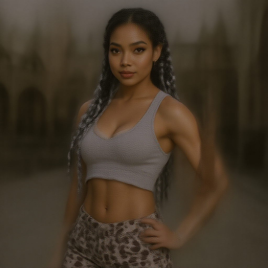 In the captivating scene, a 24-year-old Kazakh-Hungarian female CEO, a perfect blend of strength and elegance, poses confidently with a challenging head tilt. Her defined physique features a visible ribcage, smooth skin, and pronounced muscles accentuating her toned abs and flat chest, with her golden-brown skin radiating a natural post-sun glow. Her striking face is highlighted by large pill-shaped honey eyes, framed by long, graceful eyelashes, and metallic silver Dutch braids perfectly complement her sculpted eyebrows and delicate facial features. She wears a sleeveless hoodie and polka dot shorts, revealing her midriff, and strikes a victory pose on the left side of the frame, adhering to the rule of thirds. Behind her, the grandeur of Hogwarts' Great Hall provides a majestic backdrop, softly illuminated by natural light reminiscent of Paulina Olszynski's subtle style.