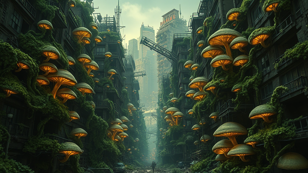 In the crumbling remains of a once-thriving metropolis now overtaken by nature's relentless evolution, the city is cloaked in dense tendrils of vibrant fungal growth, the result of an aggressive parasitic fungi that grips the urban landscape. Buildings are entwined with pulsating, bioluminescent spores casting an eerie glow over the abandoned streets. Former inhabitants have long been transformed into hollow vessels, still-standing statues of mycelium, their bodies a foundation for the fungal threads that now dictate the city's structure. As day bleeds into twilight, the air is filled with a haunting chorus of nature reclaiming its dominion, the gentle hum of spores whispering ancient secrets. Survivors navigate this alien world, seeking sanctuary in the few havens that remain untouched by the spores' reach, each step a delicate dance between hope and the omnipresent threat of becoming one with the fungal horde.