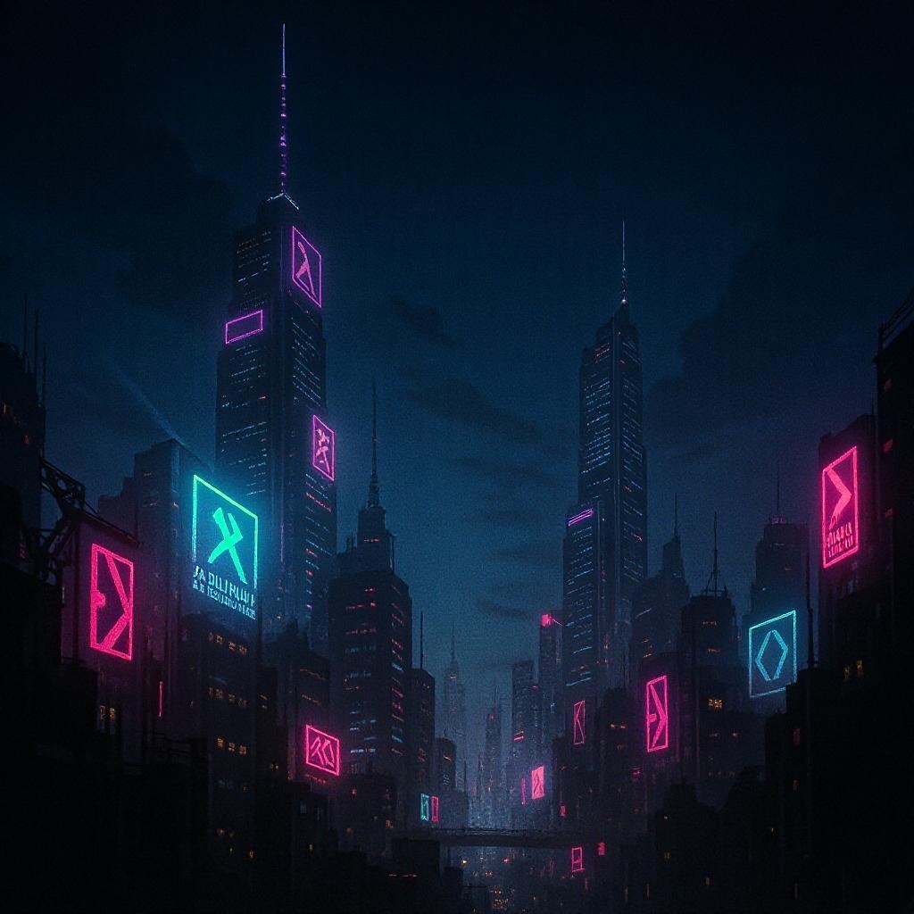 In the dark, the skyline is dominated by towering skyscrapers glowing with neon hues, their heights punctuated by vibrant holographic ads flickering in a cyberpunk dystopia. The scene is richly detailed with cinematic noise, deep contrasts, and dramatic fades, capturing an ultra-high definition 8k atmosphere that feels immersive and vivid. The vertical aspect ratio emphasizes the grandeur of the cityscape, drawing the eye upwards into the technologically saturated night.