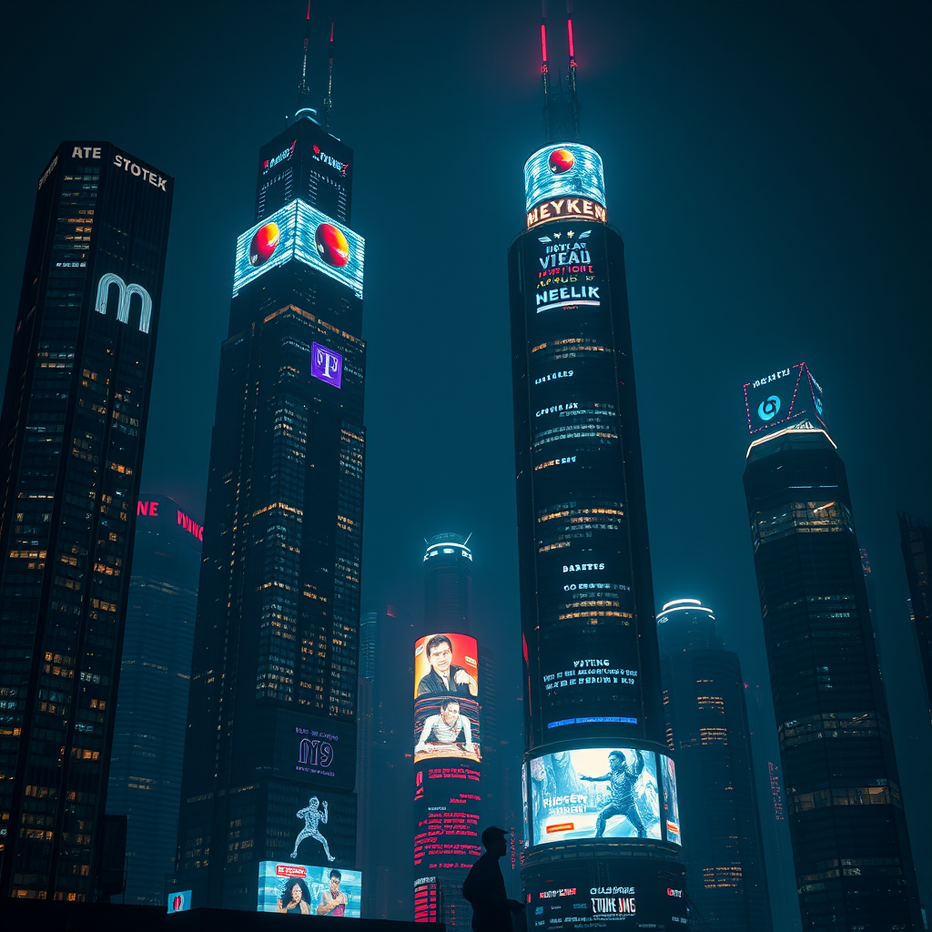 In the darkness of night, towering skyscrapers adorned with neon lights glitter against the skyline, their surfaces alive with dynamic holographic advertisements in a futuristic dystopian cityscape. The scene is highly detailed with rich cinematic noise and a gentle fade, capturing the essence with high contrast and ultra-sharp clarity reminiscent of 8k photography. Shadows and highlights interplay, enhancing the sense of depth and immersion in this vertical world.