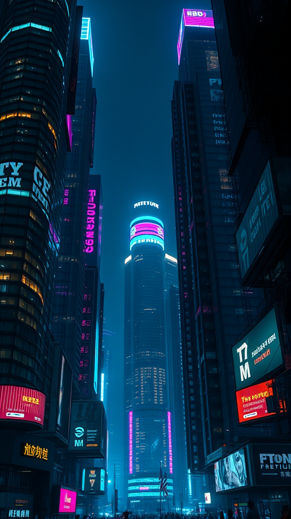 In the darkness of night, towering skyscrapers adorned with vibrant neon lights illuminate the cyberpunk landscape, casting a mesmerizing glow on futuristic holographic ads that dance across the facades. The cityscape is rich with intricate details, filled with cinematic noise and dynamic fade, contrasting starkly against the deep shadows. Captured in ultra-high definition, the scene unfolds in high contrast, 8k resolution, providing a striking, vertical aspect ratio of 9:16, where technology and dystopian elements intertwine seamlessly.