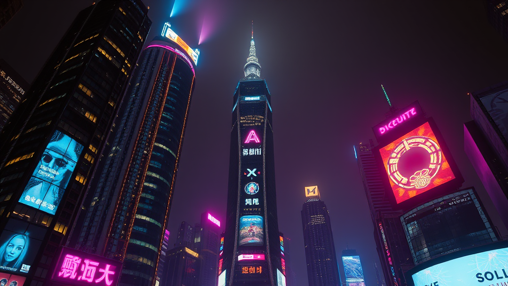 In the darkness of the night, towering skyscrapers adorned with vibrant neon lights pierce the sky, their facades alive with shimmering holographic ads that paint the skyline of a cyber dystopian city. The scene is captured with meticulous detail and a gritty cinematic noise, evoking a sense of fading grandeur. The high contrast between shadows and lights enhances the 8k resolution image, creating an immersive vertical perspective that draws you into this futuristic urban landscape.