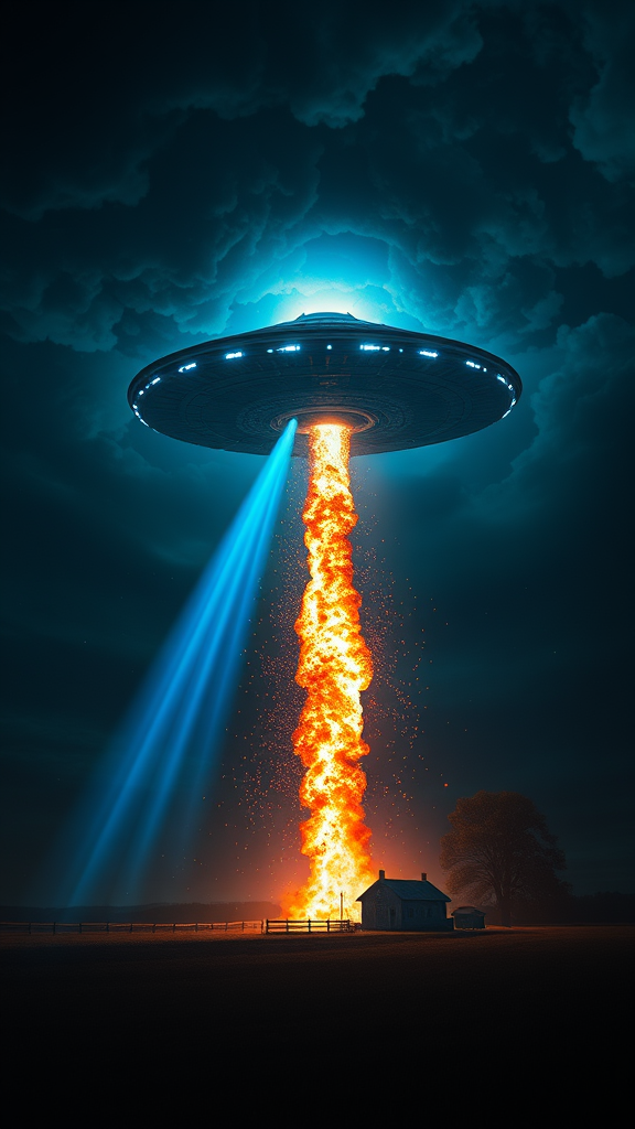 In the dead of night, an enormous spaceship looms above a solitary farm, casting an ominous shadow over the fields. Suddenly, a pulsating blue beam erupts from its underbelly, piercing the tranquil darkness. The beam strikes with devastating precision, igniting a fiery explosion that shatters the silence, scattering debris like confetti into the sky. The night is momentarily transformed into daylight as flames hungrily engulf the landscape, their dance casting flickering shadows across the surrounding countryside. Thunderous clouds gather above, their depths swirling as if mirroring the chaos below, creating a chilling, hyper-realistic tableau of sci-fi destruction.