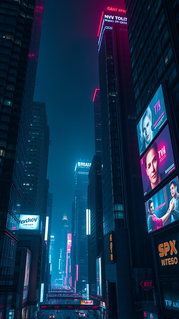 In the dead of night, towering neon-lit skyscrapers pierce the dark sky of a cyber dystopian city, their façades alive with holographic billboards flashing vivid advertisements. The scene unfolds with intricate detail, capturing the cinematic grit and texture of the urban sprawl. High contrast highlights the city's stark shadows and brilliant lights in stunning 8k clarity, set within a dynamic narrow frame.