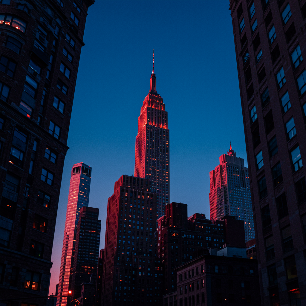 In the deep blue of twilight, towering skyscrapers loom with sharp perspective angles, bathed in light maroon and sky-blue hues, capturing the essence of raw street photography. Drawing inspiration from the American Barbizon School and Asher Brown Durand, the scene is alive with an urban energy that echoes yankeecore aesthetics. The buildings seem to pierce the sky, casting elongated shadows that play with a sense of grandeur and intimacy, rendered in mesmerizing 32k ultra-high definition. The composition is embraced by an aspect ratio of 9:16, with an atmospheric touch of surreal serenity and a slight hint of bustling life below.