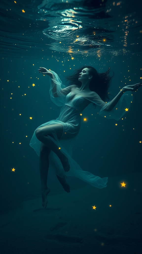 In the depths of a moonlit night, a stunning woman drifts effortlessly underwater, her form poised in a tranquil, otherworldly manner. She is adorned in a delicate, flowing chiffon fabric that flutters like a whisper, nearly transparent, enveloping her in elegant mystery. Her legs are gently crossed, and her arms stretch out in an elegant arc, her face resting just beneath the shimmering surface. The surroundings exude a cool, spectral aura, an eerie stillness that hangs in the air. Surrounding her, dozens of tiny, luminous stars float lazily, reminiscent of a whimsical fairy tale. These miniature stars emit a gentle, enchanting glow, casting a warm, tender light that bathes the scene in a magical ambiance. As they drift lazily around her, they create a surreal, dreamlike landscape, their soft, yellow-white luminance weaving into the cold, dark waters, painting dynamic patterns and lightplay across her skin, the chiffon fabric, and the dusky, sandy bottom below. The stars seem alive, like a constellation transformed into this underwater domain, their brilliance heightened by beams of light cutting through the water, dancing amidst gentle ripples. Air bubbles escape softly from her attire, introducing a sense of realism and fluid movement. Her hair trails around her like silken strands, swaying with the tender underwater currents, enhancing the weightless, ethereal sensation. The starry glow accentuates the delicate textures of her skin, the graceful chiffon, and the rippling water, bestowing the scene with a timeless, cinematic quality that speaks of medium format artistry.