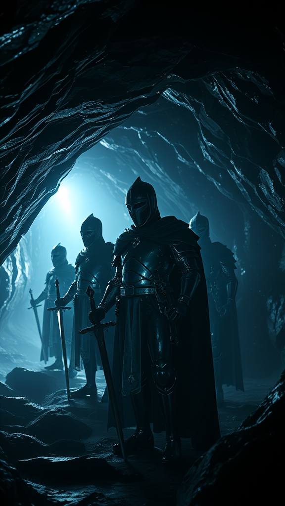 In the depths of a mystical cave, shadow knights stand guard, their forms transparent and ethereal. The scene is illuminated by surreal caustics and magical optics, casting intricate reflections on the cave's walls. Each knight is a masterpiece of perfect anatomy, captured in 32k UHD resolution, with unparalleled quality and detail. The photorealistic portrait is shot from a cinematic angle, highlighting the sharp focus and mesmerizing play of reflection lights. This highly detailed image, free from imperfections, presents a captivating tableau of dark fantasy with no out-of-place elements.