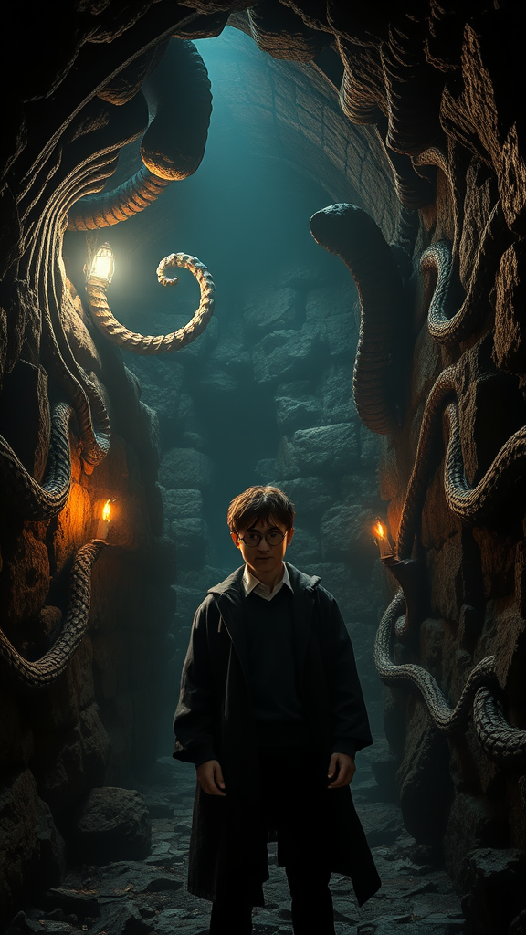 In the depths of a shadowy dungeon, Harry Potter stands surrounded by an eerie aura, his glasses reflecting the flickering, mystical light that dances across the damp stone walls. The scene is filled with intricate, highly detailed textures that evoke a sense of nightmarish wonder. Twisted, organic forms inspired by H.R. Giger loop around the space, creating a surreal, almost alien environment that pulses with a life of its own. Ethereal, magical elements woven into the rugged surroundings inject an element of the fantastical and surreal, akin to the enchanted illustrations of Jean Ansell and the vivid storytelling art of Justin Gerard. The dynamic lighting creates deep contrasts, casting long shadows that play tricks on the eye, making it a place both wondrous and unsettling, a creeping, otherworldly vision where dark magic whispers just out of sight.
