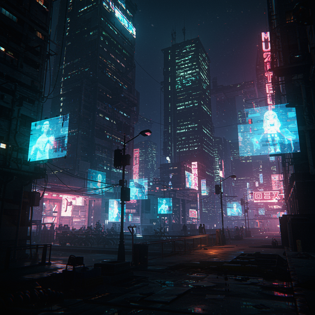 In the depths of night, a sprawling cityscape unfolds, where towering skyscrapers are illuminated by vibrant neon lights, casting a kaleidoscope of colors across the streets. Holographic advertisements dance on the façades, their images flickering in the air with an eerie allure. This cyber dystopian metropolis is captured with meticulous detail, every shadow and glow rendered in cinematic noise that adds a gritty texture to the scene. A subtle fade blurs the edges, enhancing its dreamlike quality, while the high contrast sharpens the division between light and darkness. The image is of breathtaking clarity, as if viewed through an 8k lens, capturing the stark beauty of this future world, its dreamy grandeur framed in an elongated perspective that captures the verticality and oppressive scale of the environment.