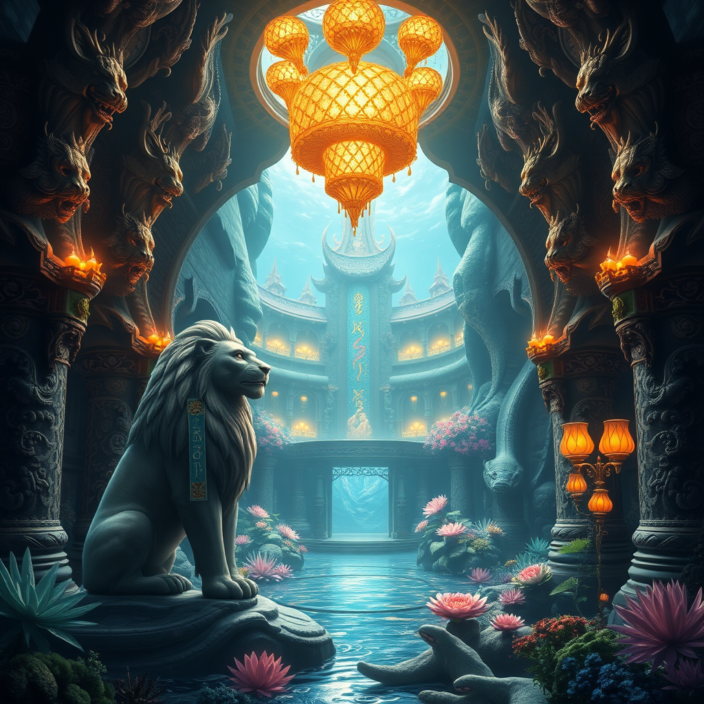 In the depths of the ocean, a magnificent palace was carved into the sides of an underwater mountain, its presence radiating an aura of regal splendor. Before the palace gates, a colossal stone lion stood vigilant, its imposing form beckoning visitors to enter the mystical realm within. As one stepped inside, the interior of the palace revealed a world of exquisite wonder, with dragon pillars adorned with intricate carvings of mythical creatures, their faces seemingly bent in rapt attention as if listening to the whispers of the palace itself. The air was alive with an otherworldly energy, pulsating through every nook and cranny like a gentle current that stirred the senses. The palace was a tapestry woven from threads of wonder, with a quiet river meandering lazily through the central courtyard, its glassy surface reflecting the warm glow of luminescent orbs that hung like stars in the vaulted ceiling. A delicate garden bloomed in the palace's heart, its petals shimmering with colors that defied the depths, like rare jewels plucked from the darkness. Schools of rainbow-hued fish darted and weaved through the water, their synchronized movements a breathtaking display of choreographed majesty, as if responding to a symphony only they could hear. Vibrant corals and shells of every shape and hue were scattered about like treasured artifacts, adorning the walls and surfaces of the palace, each one telling a unique story of the underwater world's secrets and mysteries. And then, there was the music: a soft, whispery hum that seemed to emanate from the very essence of the palace itself, a gentle melody that ebbed and flowed like the tides, lulling all who entered into a state of ethereal tranquility. The palace of the underwater world was more than just a marvel of architecture; it was a living, breathing entity, pulsing with life, magic, and an untold history that whispered secrets only to those who dared to listen. At its heart, a sprawling throne room pulsed with vibrant colors, like a large kelp forest amidst the coral reef, with various schools of small, rainbow-colored fish darting through the majestic throne, leaving behind a trail of shimmering light and an eternal sense of mystique that seemed to linger in every contour of the palace. Here, in this mystical realm, time itself was fluid, and the past and future intertwined like the tender shoots of a coral growth, inviting all visitors to partake in the eternal dance of the ocean's song.