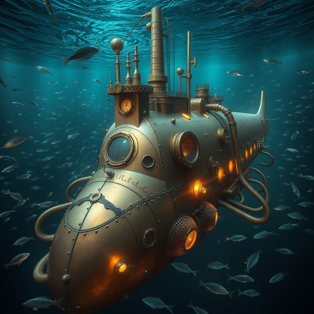 In the depths of the ocean, an expansive view reveals a magnificent steampunk submarine, its brass exterior gleaming with a patina of age. Inspired by the legendary Nautilus of Jules Verne, the vessel is adorned with an array of intricately designed gears and pipes, with glowing portholes casting an eerie light in the aquatic darkness. Mechanical tentacles extend from its hull, resembling an enigmatic sea creature, as schools of bioluminescent fish swirl around, illuminating intricate etchings and rivets that hint at countless adventures beneath the waves.