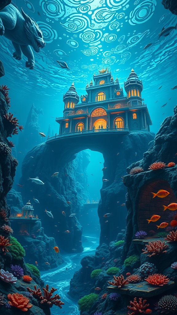 In the depths of the ocean, an underwater palace majestically rests atop a sea mountain, flanked by a colossal stone lion that stands as the guardian of the realm. The palace's interior is a marvel of intricate design, with dragon pillars carved to resemble enigmatic sea creatures that appear to listen intently to the echoes within. Each corner of the palace radiates a distinct atmosphere; there is a serene river and a tranquil garden illuminated by luminous lights, casting a glow reminiscent of a starry night. Schools of fish glide gracefully through the waters, their vibrant colors rivaled only by the corals and shells that decorate the palace like masterpieces. Here, one is transported to an enchanting and mysterious kingdom where fish, sharks, turtles, and iridescent bubbles drift in a dreamlike dance.