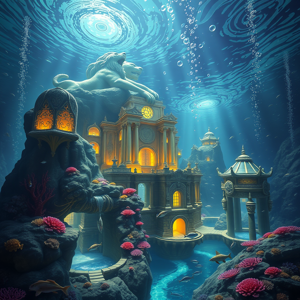 In the depths of the ocean, an underwater palace rises majestically atop a hidden mountain, guarded by a colossal stone lion that reflects the sovereign's grandeur. Inside, the palace unfolds with intricate elegance, its towering pillars adorned with exquisite carvings of mythical sea creatures that seem to whisper secrets only they can hear. Each chamber breathes a unique ambiance, featuring serene streams and tranquil gardens illuminated by glimmering lights, reminiscent of a shimmering night sky. Schools of fish glide gracefully through the water in a mesmerizing dance, while vivid corals and shells create a tapestry of natural artistry, embellishing the palace's underwater realm. This enchanting sanctuary transports visitors to a realm of wonder, surrounded by a multitude of sea creatures—fish, sharks, turtles—and shimmering bubbles that spiral towards the surface.