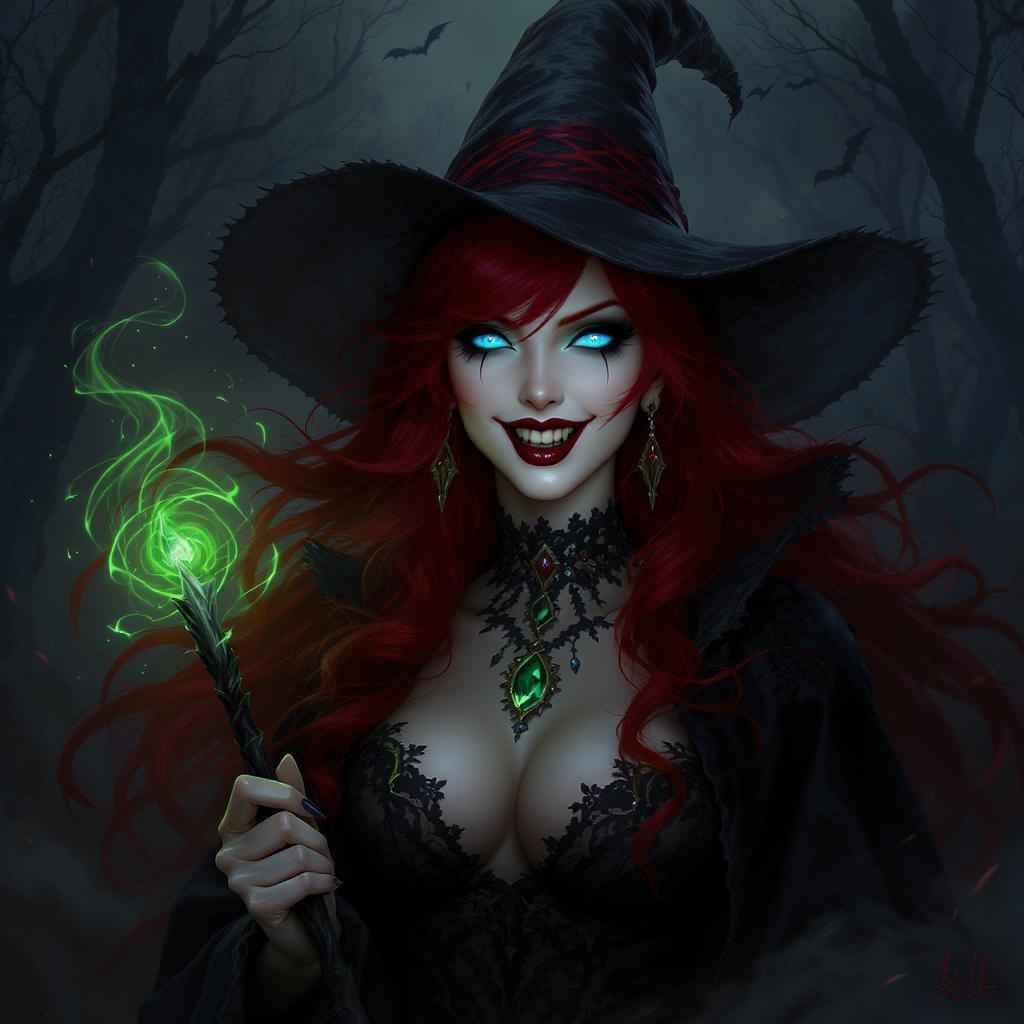 In the digital fantasy artwork, the central figure is a captivating witch with striking features. She is a woman with porcelain skin and vibrant crimson hair cascading in loose waves. Adorning her head is a traditional black witch's hat, paired with a dark cloak trimmed with intricate lace. Her eyes, a mesmerizing shade of electric blue, glow with an otherworldly light, while her wide smile reveals sharp, elongated fangs. In her right hand, she clutches a wand, from which a swirling green magical aura emanates. Around her neck, she wears an elaborate, black choker adorned with an emerald gemstone pendant. The background is a shadowy, mist-laden forest where the silhouettes of soaring bats contribute to the mystical and eerie ambiance. The color palette consists mainly of deep tones accented by bursts of red and green, enriching the supernatural theme of the image.