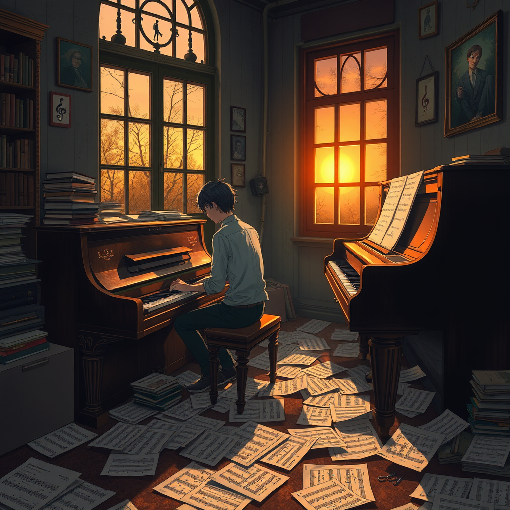 In the dim glow of a sunset filtering through the dusty windows of a forgotten studio, an introverted anime boy sits at an aged piano. The room, filled with the scent of old books and the aura of academia, resonates with haunting melodies as his fingers dance across the ivory keys. Scattered sheets of music tell stories of solitude and introspection, capturing the essence of a world where dark academia and silent sunsets intertwine.