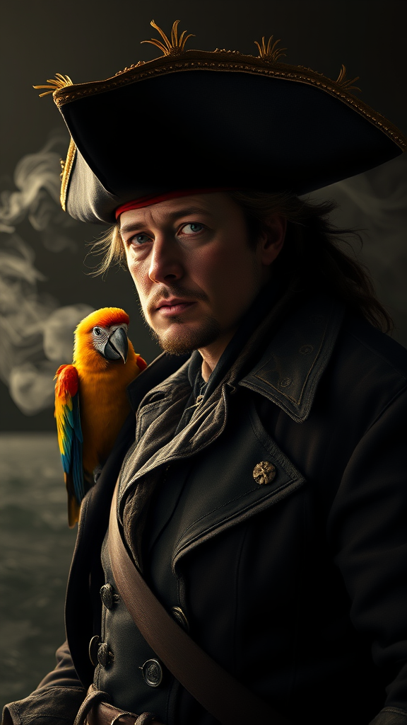 In the dim glow of cinematic light streaming from the left, a 1700s pirate captain stands resolute amid swirling smoke, his silhouette echoing the bold stature of a legendary figure. His features, eerily reminiscent of Elon Musk, are framed by unruly hair and a weathered tricorn hat adorned with gold trim. A vibrantly plumaged parrot perches on his left shoulder, its keen eyes scanning the horizon. The captain's eyes are sharp and visionary, a hint of adventurous audacity glinting in their depths. His coat, richly embroidered and slightly worn, flutters in the sea breeze. The scene is captured in the dramatic chiaroscuro typical of a Rembrandt painting, the shadows playing across his face and highlighting the rugged determination etched into his features.