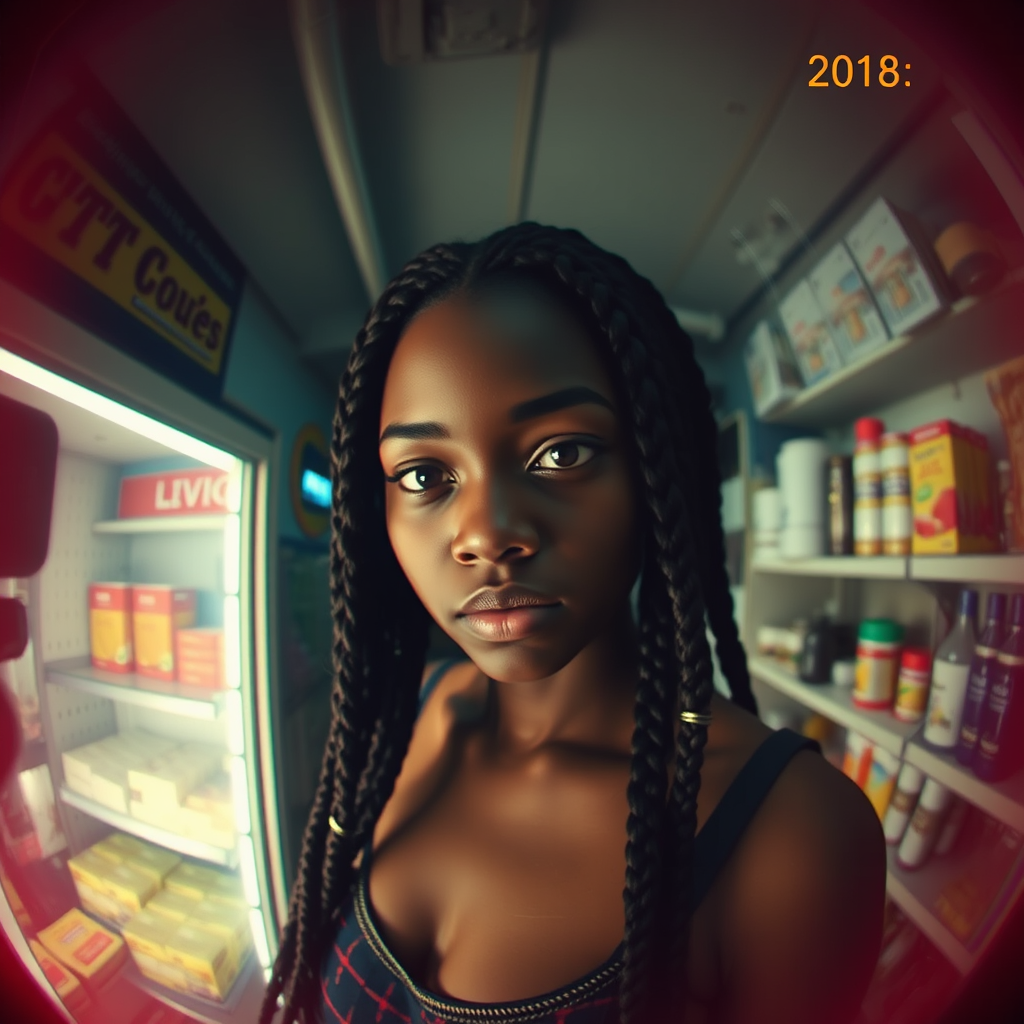 In the dim glow of the rundown store, a low-quality CCTV camera captured the scene with a slightly fish-eye lens effect, emphasizing its grainy, low-resolution charm. The timestamp flickered in the corner, surrounded by static lines that danced across the screen. Through this vintage filter, Samantha emerged, an intriguing figure whose youthful beauty was adorned with intricately braided hair and a confident demeanor. Her presence seemed to defy the mundane setting, her charismatic aura almost palpable despite the dated technology capturing her image.