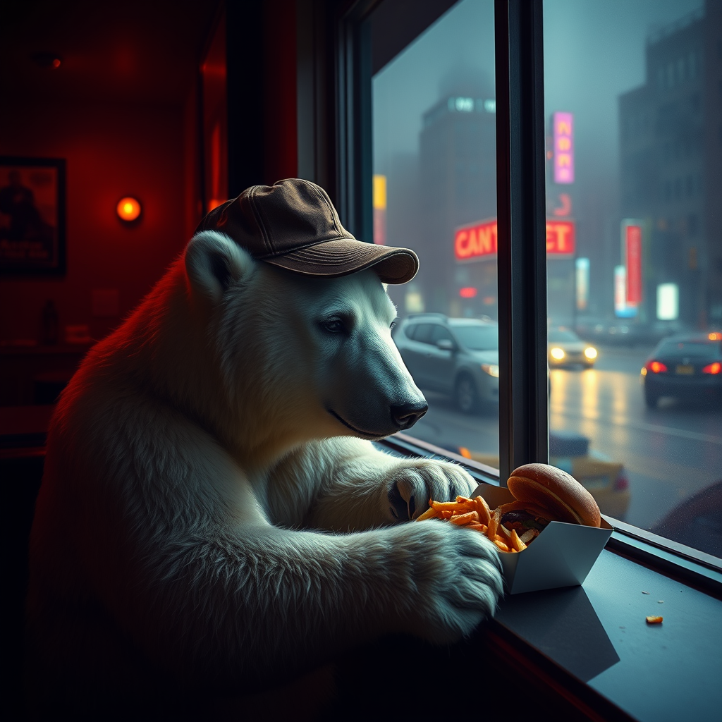 In the dim light of a deserted Manhattan cafe, a solitary polar bear, donning a weathered baseball cap, sits pensively by the window. Outside, the bustling city is shrouded in mist, and the bear, a portrait of loneliness, stares blankly at a half-eaten hamburger and fries. The scene, captured in vivid detail, mirrors the signature style of Miles Aldridge, with its saturated colors and dramatic contrasts, casting an ethereal glow on the bear's fur and the retro decor of the diner, evoking a sense of melancholy and quiet introspection.