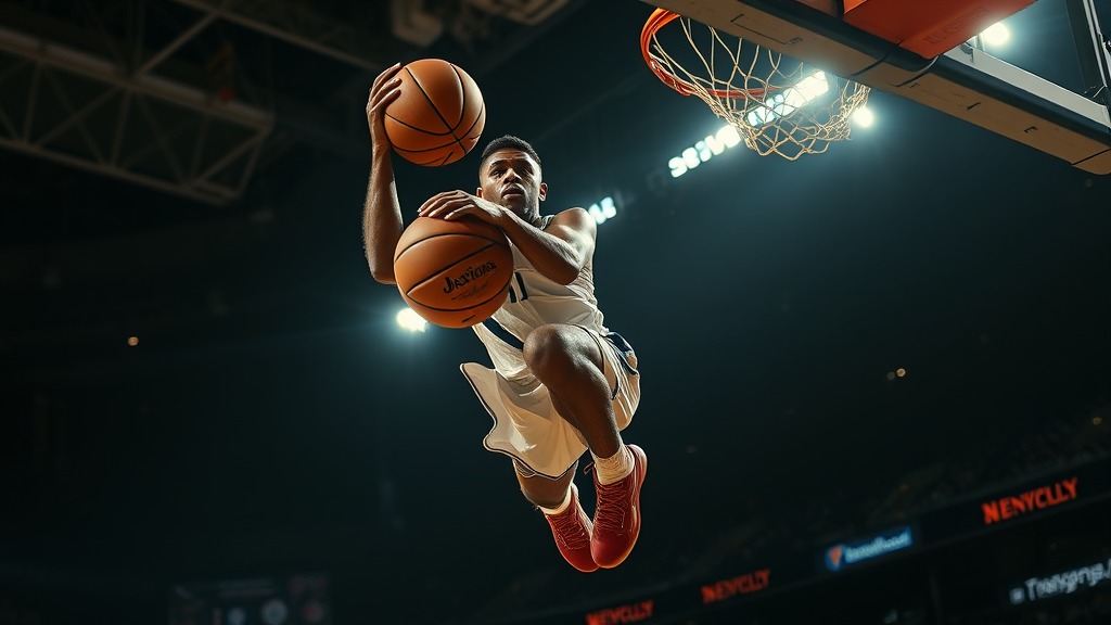 In the dimly lit arena, capture a hyper-realistic basketball highlight featuring an explosive slam dunk by a professional athlete. The player should be mid-air, suspended above the rim, with sweat glistening on their face, displaying raw determination. Focus on the player's powerful hands gripping the basketball, highlighting the intensity of the moment. Stadium lights cast dramatic shadows on the court, emphasizing the athlete's dynamic motion. Camera: Sony A9 III, Lens: Sony FE 70-200mm f/2.8 GM. Settings: Shutter Speed 1/1000 sec, Aperture f/2.8, ISO 8000. Focusing: Continuous AF with tracking, Burst Mode: High-speed continuous shooting. Lighting: Main source is stadium floodlights at an angle, illuminating the player's face and body. Use a softbox as fill light to fill in shadows and highlight details. A spotlight accents the player's silhouette against the background, while subtle rim lighting separates the player from the background. Frame the athlete slightly off-center to create a dynamic composition. A 16:9 aspect ratio captures the width of the court and the player's motion, keeping the background blurred to draw focus to the athlete and the action. Convey the electrifying atmosphere of the game by emphasizing energy, passion, and athleticism. The image should exude intensity and excitement, making the viewer feel immersed in the action. Post-production enhances details, sharpness, and contrast for a hyper-realistic effect, with colors adjusted to make the athlete's jersey and basketball pop while maintaining the moody ambiance of the stadium.