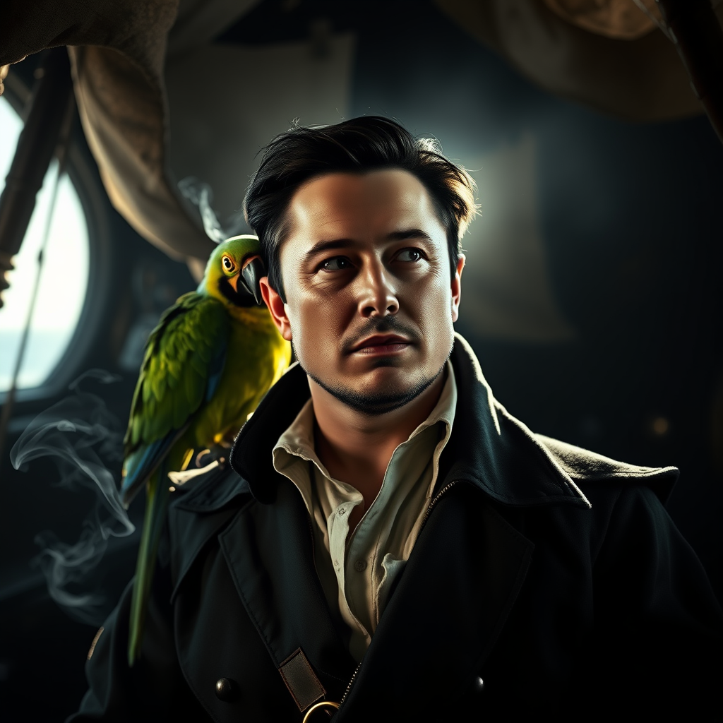 In the dimly lit cabin of a creaking galleon, Captain Elon Musk stands resolute, embodying the fierce spirit of a 1700s pirate. His sharp gaze is cast toward the horizon, illuminated by a soft, cinematic light streaming in from the side, enhancing the dramatic shadows on his angular face. Perched on his left shoulder is a vivid, emerald-feathered parrot, its keen eyes mirroring the captain's unyielding determination. Swirls of smoke drift lazily around him, mingling with the scent of the sea, as canvas sails rustle overhead. His attire, a blend of rugged pirate garb and opulent hints of the era, hints at a mind both inventive and unorthodox. The scene exudes a timeless energy reminiscent of a Rembrandt painting, capturing the intricate interplay of light and shadow on this audacious seafarer's visage.