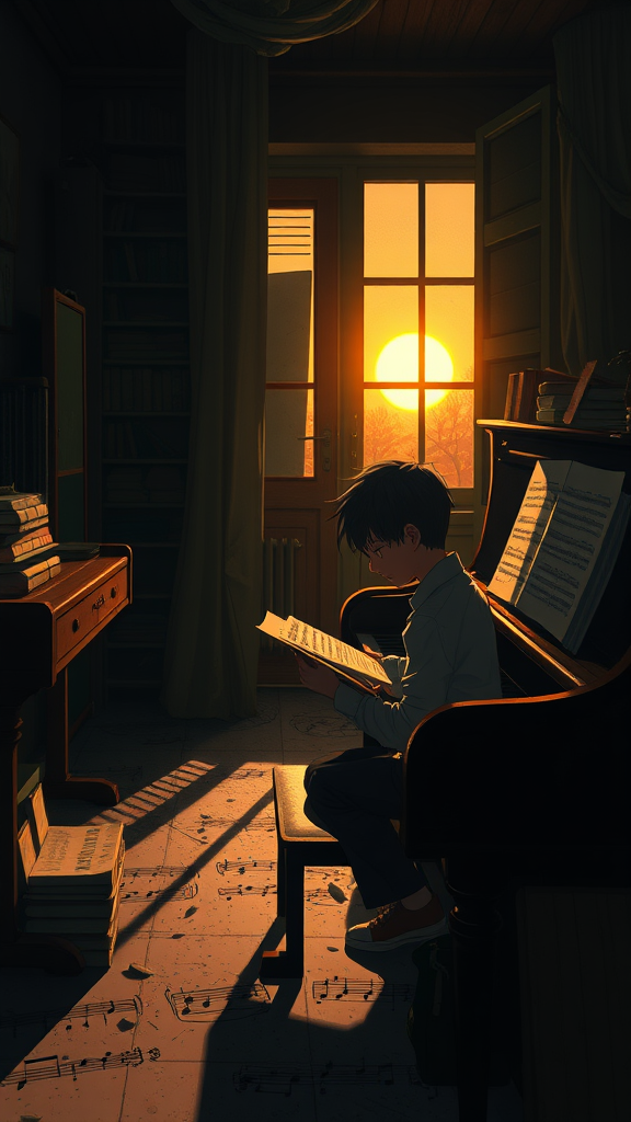 In the dimly lit, dusty studio, an introverted anime boy, immersed in a world of academia, sits at an old piano. As the sunset casts a golden glow through the window, he flips through yellowed sheets of music. The aura of dark academia surrounds him, each note echoing his solitary introspection, creating a melancholic melody that fills the tranquil space.