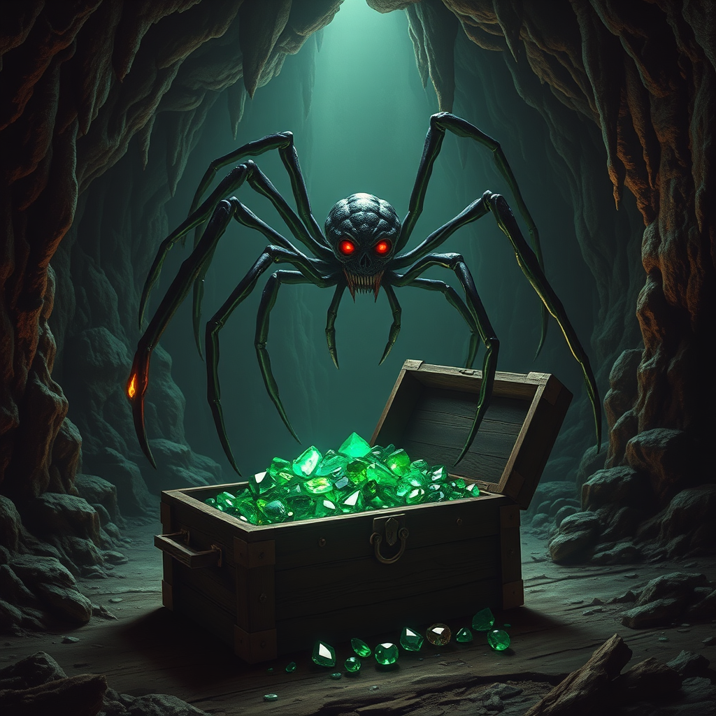 In the dimly lit recesses of a cavernous lair, a haunting creature emerges, its arachnid form weaving shadows across the jagged walls. This entity, an imposing blend of horror and elegance, possesses elongated limbs that glisten under the flickering torchlight, each movement deliberate and unnervingly silent. Its multitude of eyes pierce the darkness—an unsettling, otherworldly glow radiating from their deep crimson hue, as though they are embers fueled by an ancient, malevolent fire. The air hangs heavy with tension and the metallic scent of fear, accentuated by the creature's ominous presence. Amidst the stalactites and echoes of the cave, an open wooden chest rests on the uneven ground, its aged timbers gnarled and splintered by time. Within the depths of the chest, an opulent pile of emeralds glimmers alluringly, each gem capturing and reflecting light in a dance of verdant luminescence. These jewels, with their all-consuming brilliance, seem to pulse with a life of their own, enchanting yet foreboding, beckoning yet threatening. The scene is painted with exquisite detail, every facet of the creature's alien anatomy rendered in cinematic clarity, and the ambient environment rich in high-resolution textures. Together, these elements form a stunning tableau, a compelling mixture of fantasy and terror, that invades the boundaries of reality and immerses the onlooker in a world where beauty and dread coexist in a delicate, dangerous balance.