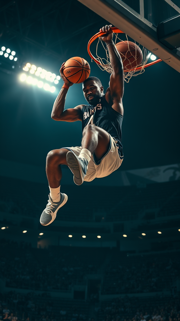 In the dimly lit stadium, capture a hyper-realistic basketball highlight featuring an explosive slam dunk by a professional athlete. The player is mid-air, suspended above the rim, with sweat glistening on their face, showcasing raw determination. The shot zooms in on the player's powerful hands gripping the basketball, capturing the moment's intensity. Dramatic shadows are cast on the court by the stadium lights, emphasizing the athlete's dynamic motion. The Sony A9 III camera with a Sony FE 70-200mm f/2.8 GM lens is set to a shutter speed of 1/1000 sec, aperture f/2.8, and ISO 8000. Continuous AF with tracking ensures sharp focus, while high-speed continuous shooting captures the action. The lighting setup includes stadium floodlights angled to illuminate the player's face and body, a softbox to fill in shadows and highlight details, a spotlight on the player's silhouette, and subtle rim lighting to separate the athlete from the background. The composition frames the athlete slightly off-center in a dynamic 16:9 aspect ratio, capturing the width of the court and the player's movement, with a blurred background to draw focus to the action. The mood conveys the electrifying atmosphere of the game, emphasizing energy, passion, and athleticism, making viewers feel like they are in the middle of the action. Post-processed to enhance details, sharpness, and contrast, the colors of the athlete’s jersey and the basketball are adjusted to pop, maintaining the moody ambiance of the stadium.