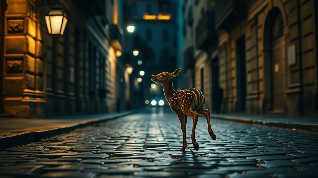 In the dimly lit streets of Rome, a baby deer prances with glee, its laughter echoing softly against ancient cobblestones. The dark lights of the city cast a cinematic glow, highlighting the exquisite details of the scene in hyper-realistic clarity, capturing the joyful dance of the young creature in stunning 4k resolution, as it playfully explores the timeless beauty of its surroundings.