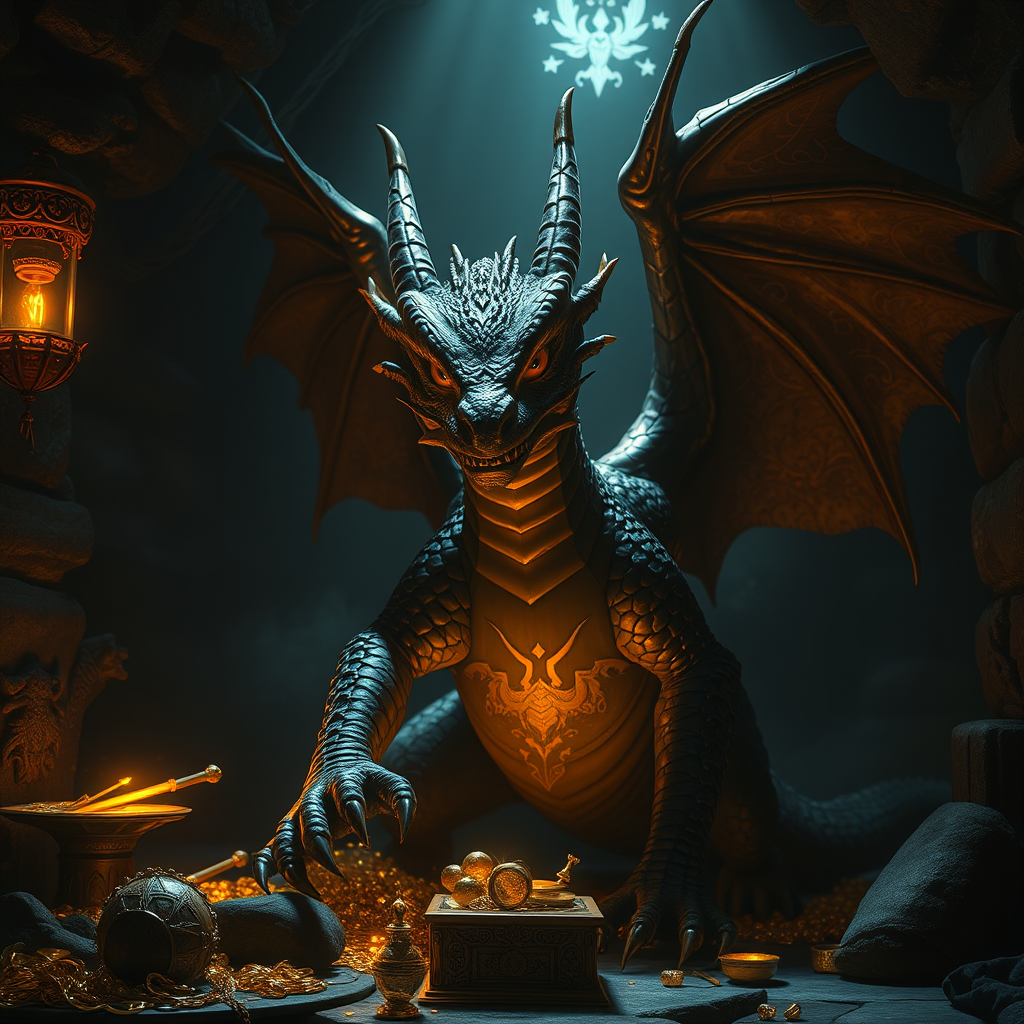 In the dimly lit treasure chamber, a cunning dragon guardian stands vigilant, its eyes gleaming with sharp intelligence. This formidable protector of glittering gold and ancient artifacts is ever ready to unleash its fiery breath and wield its lethal claws against any who dare trespass. The dragon's presence is intimidating, its posture poised and alert, ensuring that no intruder escapes its watchful gaze. The chamber itself is a testament to the dragon's dedication, filled with treasures that shimmer in the faint light, each piece a symbol of the dragon's unwavering guardianship.