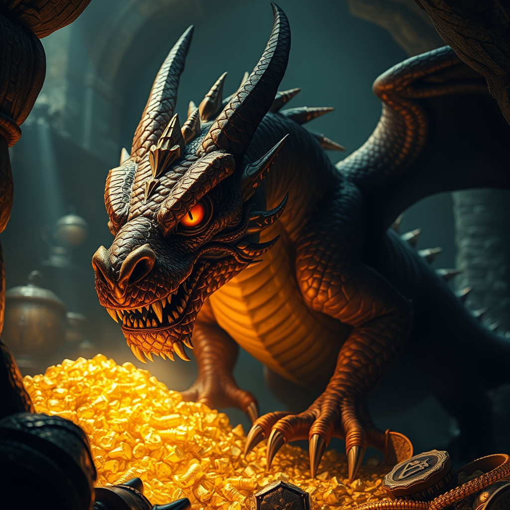 In the dimly lit treasure chamber, the cunning dragon guardian stands with razor-sharp focus. Its eyes, gleaming with strategic intelligence, survey the glittering gold and invaluable artifacts that surround it. The dragon's powerful form is a formidable presence, ready to defend its hoard with deadly precision. Its scales shimmer in the low light, a testament to the treasures it protects. As a master of its domain, this vigilant protector is prepared to unleash its fiery breath and lethal claws upon any who dare intrude, ensuring the sanctity of its hidden realm remains unchallenged. In this secretive enclave, underestimating the dragon's might would be a perilous mistake.
