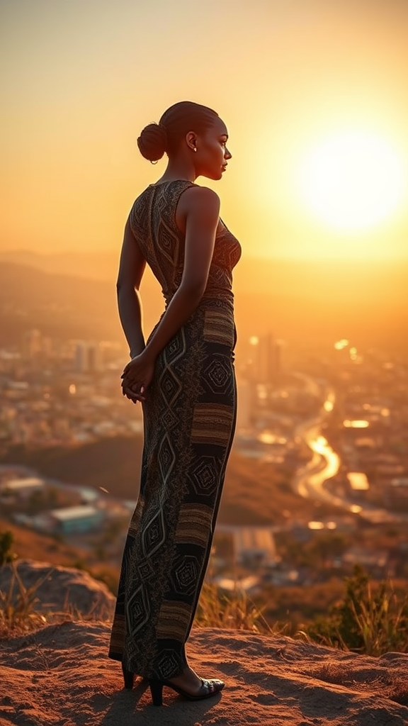 In the distant 24th century, a breathtaking Bissau-Guinean woman stands on a hill under the golden hour's warm glow, captured in stunning photorealism. Embracing Afrofuturistic elegance, she wears a sleek Vibranium battle dress adorned with striking black and gold kente patterns. As a space captain, she exudes confidence, her hands clasped behind her back in a commanding stance. Behind her, the cityscape glows with Wakanda-inspired architecture, marking her return after a seven-year journey patrolling the galaxy's outer spiral arm. She gazes into the distance over the magnificent Fouta Djallon region, embodying the epic yet intimate moment of homecoming. Influenced by cinematic beauties like Interstellar and Black Panther, the scene is imbued with a powerful sense of return and heritage. Directed by Ava DuVernay, this epic vision unites tradition with cosmic exploration in a narrative radiating strength and grace.